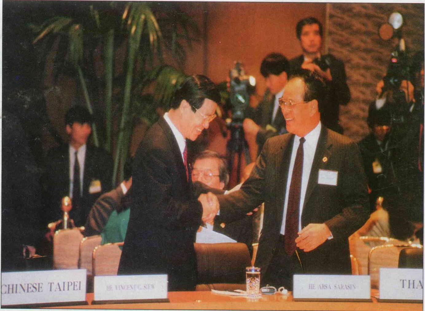 今年十一月,在韓國漢城,泰國外交部長沙拉欣(左)向我國經濟部長蕭萬長致意,歡迎我們成為亞太經合會一員。(蔡文祥攝)