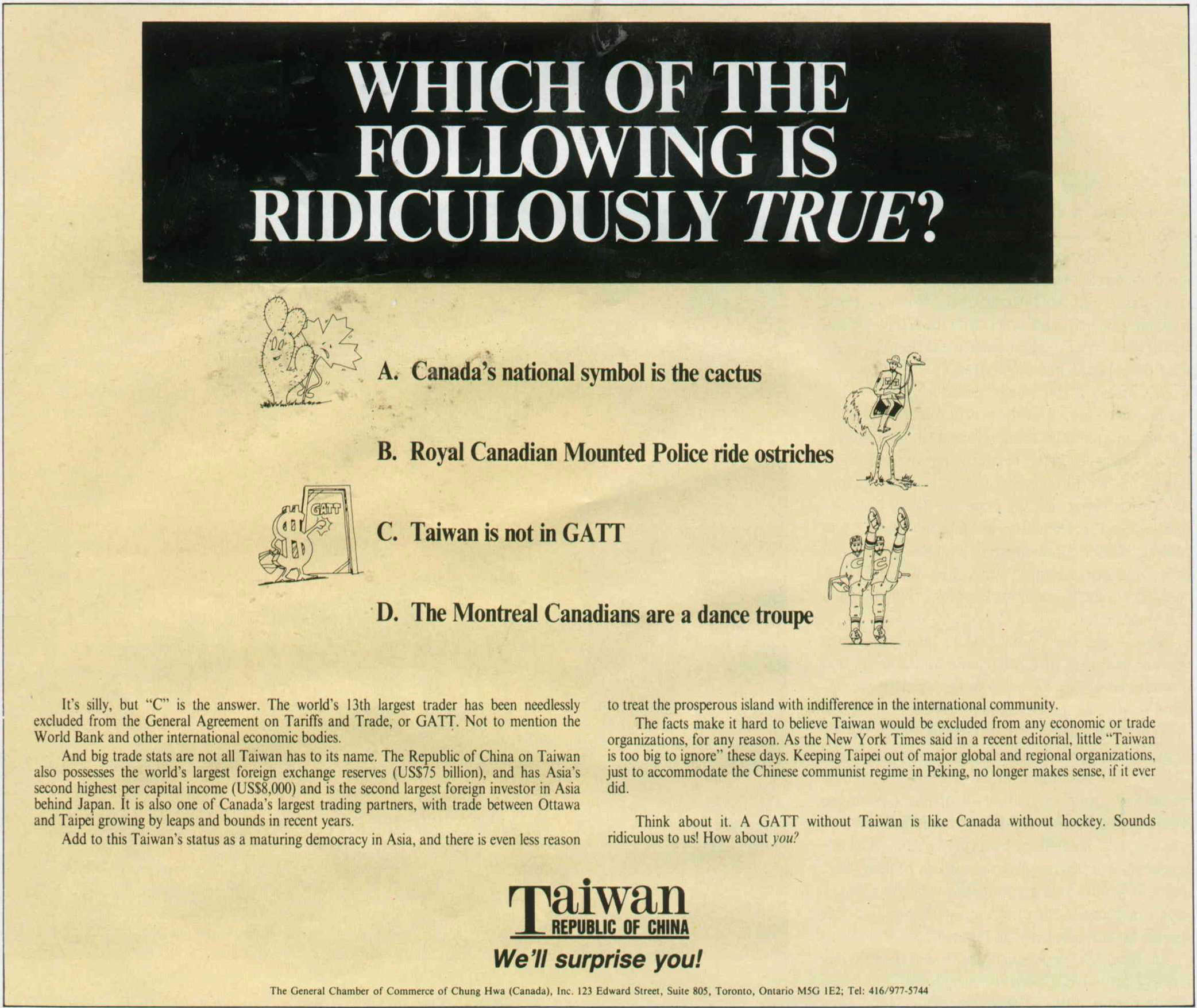 這則廣告被形容為「火力十足」。它強調:以中華民國今天的經濟實力——全球第一的外匯存底、亞洲第二大投資者、全球第十三大貿國(編按,七十九年為第十五位)、美國第六大貿易夥伴——卻不是關貿總協成員的荒謬。此外,廣告中也提出,台灣擁有市場經濟制度,擬以關稅領域名義加入,一切符合規定,所有的阻撓卻來自一個資格根本不符合者——中共。這是誰在製造麻煩?為什麼國際及美國對此要無限地蹉跎下去?難道只為了中共的蠻不講理?