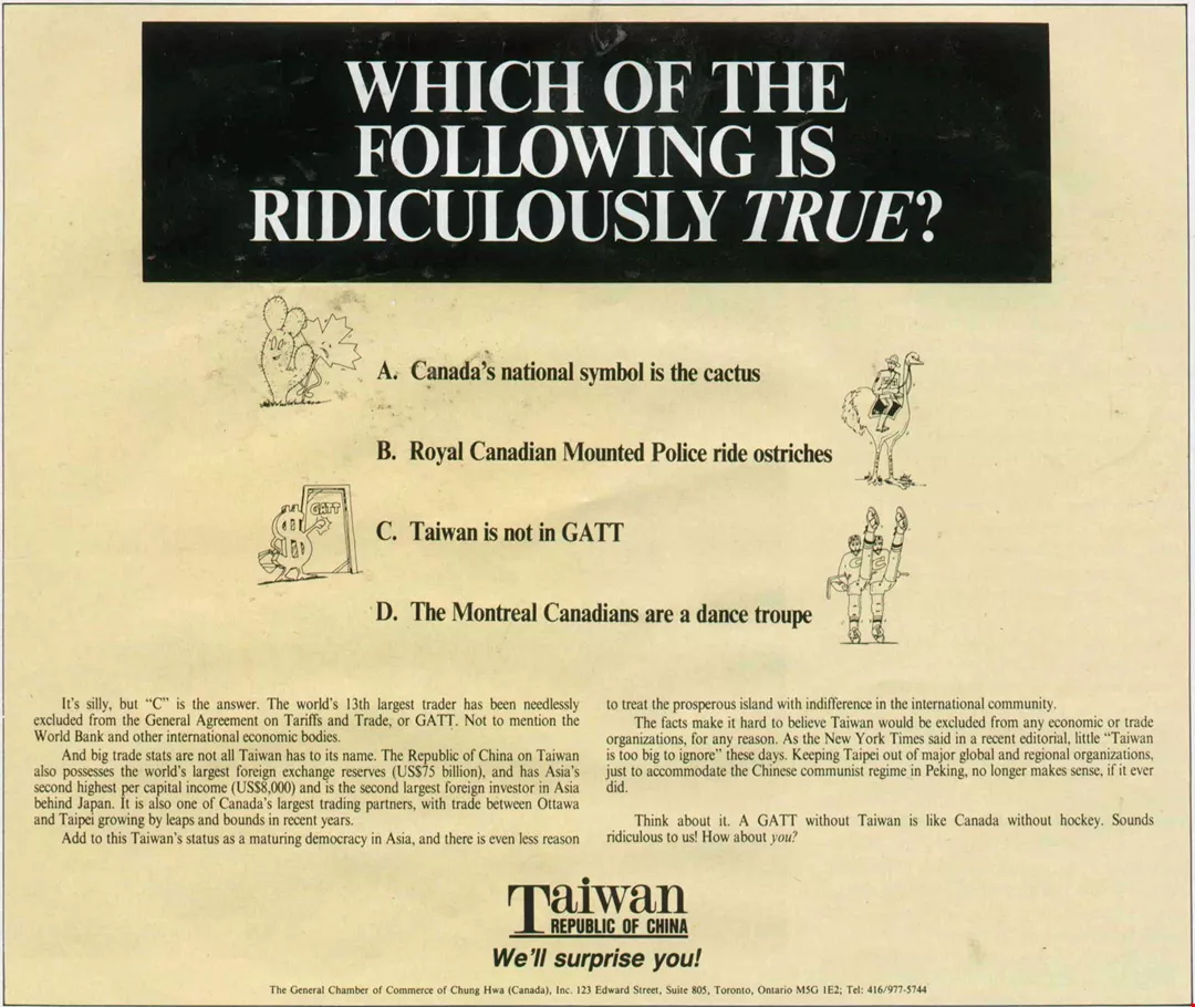政府在美、加等國知名媒體刊登廣告,呼籲支持我加入關貿總協。(邱瑞金)