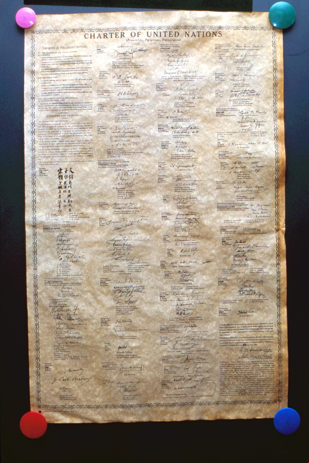 原始的聯合國憲章上,仍留有中華民國代表的簽名。(邱瑞金)