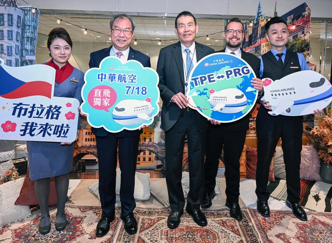 經多年談判,華航終於正式開闢「台北—布拉格」直航,也是台灣目前唯一直飛捷克的航空公司。首航時,華航董事長謝世謙(中)、捷克經濟文化辦事處代表史坦格(右2)齊聚慶祝。(中華航空提供)