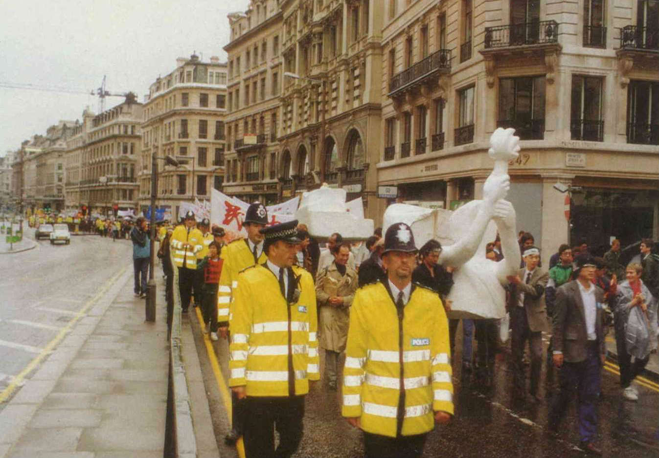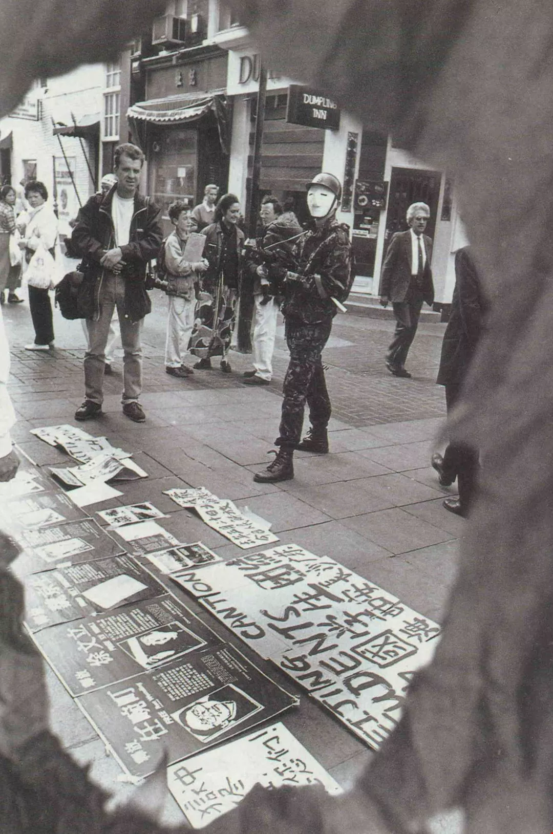 說話的是甫因採訪去年天安門大屠殺,而得到英國記者獎(British Press Awards)年度國際採訪獎的Jonathan Mirsky。他在稍後倫敦觀察家報的專文中,也提及這段經驗。他形容,武裝警察對著外籍記者毆打、恐嚇、追趕,最後逮著他們四個,用自動步槍頂向牆邊;此情此景,彷彿就是電影「鴉片戰爭」中奮勇擄獲外籍兵團的一隊清軍。
