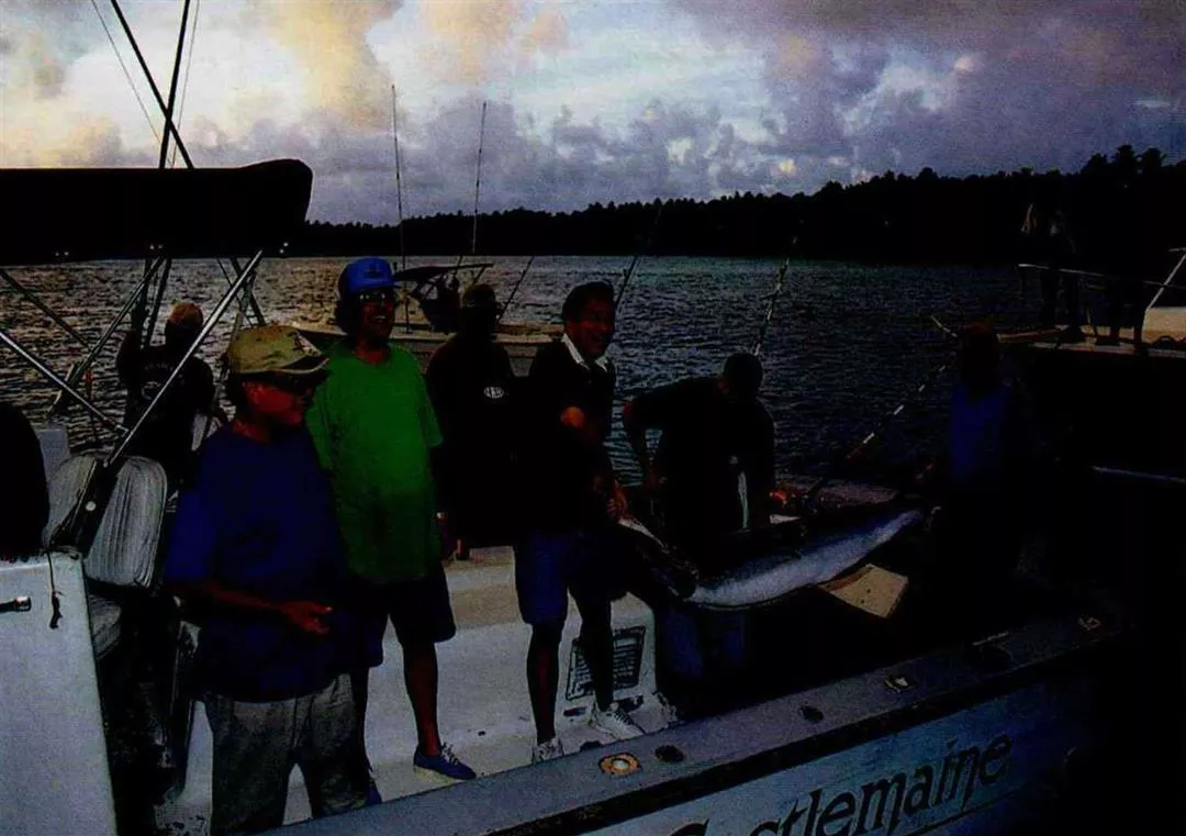 馬紹爾附近海域漁業資源豐富,圖為我國訪問團成員與馬國官員共同展示海釣的成果─一一尾幾乎與人等高的馬林魚。