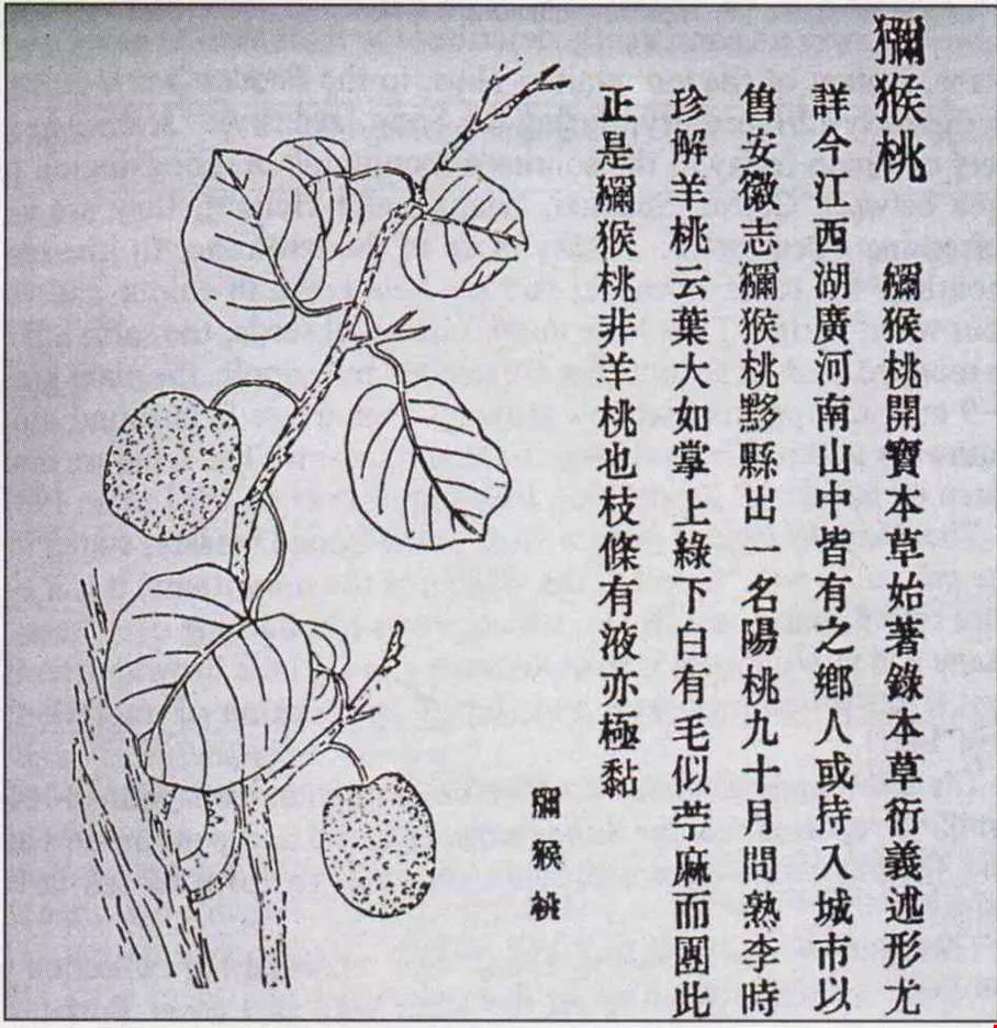 此外,《本草衍義》、《開寶本草》、《本草拾遺》等藥典,對獼猴桃也有不少論述。有的描述其形貌「葉大如掌,上綠下白,有毛似苧麻而團」,「子繁細,其色如芥子,枝條柔弱,高二三丈,多附木而生」;有的記敘它生長的地方「淺山道旁則有存者,深山則多為猴所食矣」;有的闡述其功用「食之解實熱」,「其實形似雞卵大,經霜始甘美,可食,皮堪作紙」。