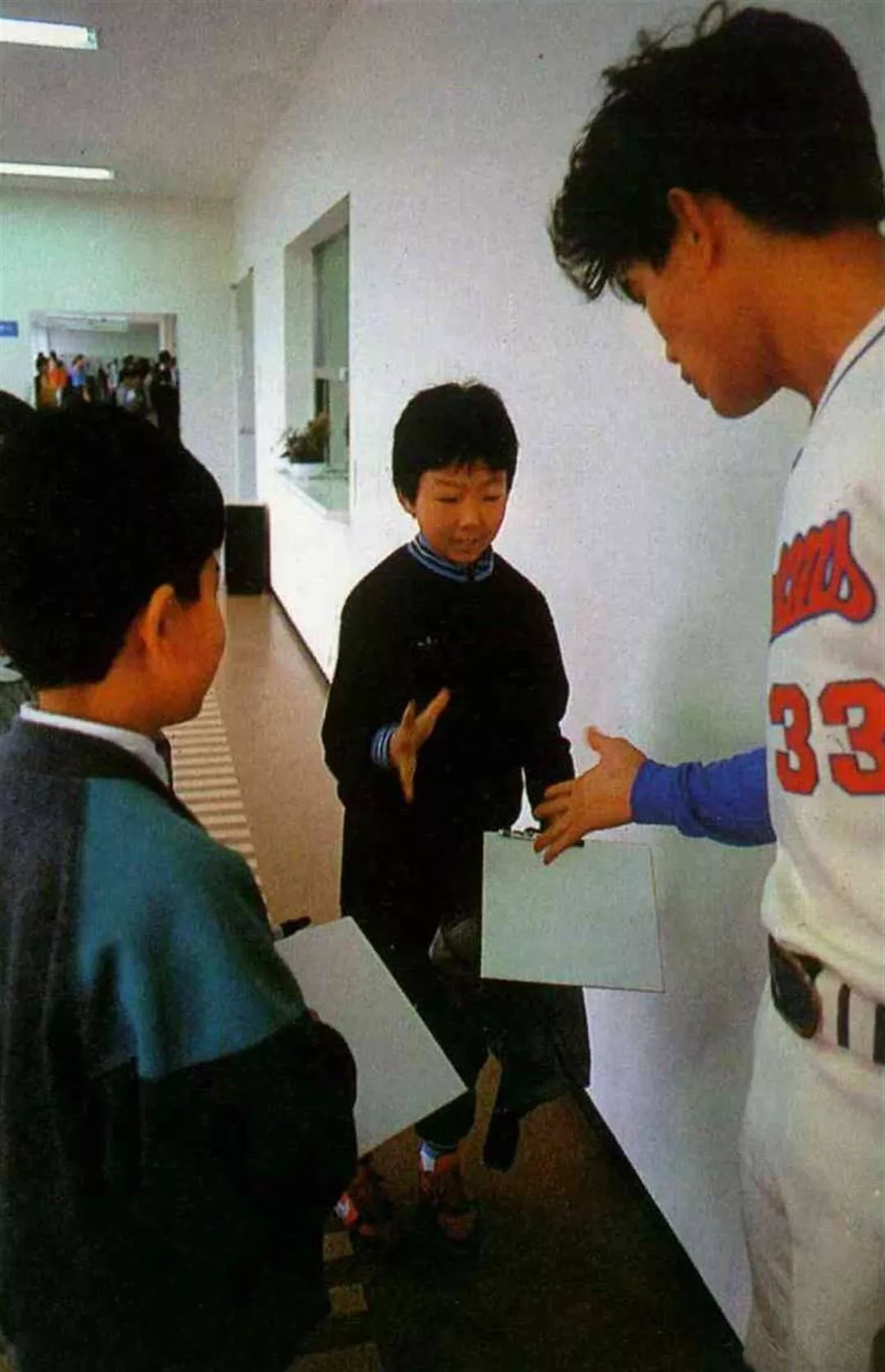 「你贏了,我幫你簽名!」稚氣未脫的郭源治與要求簽名的球迷猜拳。(鄭元慶)