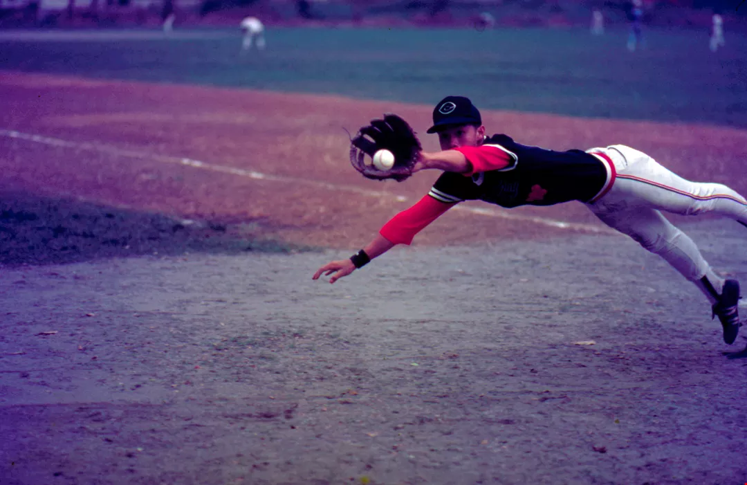 圖2:棒球比賽中,經常出現這種「飛身救球」的鏡頭。(鄭元慶)