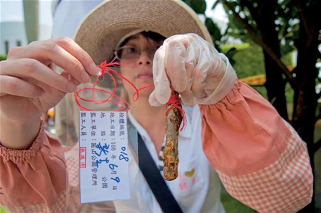 台北市政府公園路燈管理處正在為新生公園的欒樹執行褐根病樹的防治工程,先砍伐樹木、挖除根部,再進行土壤的燻蒸消毒。左圖為刻意培養當作「檢測試體」的帶菌枝條,由監工親自綁上名條及紅線再埋入土中。