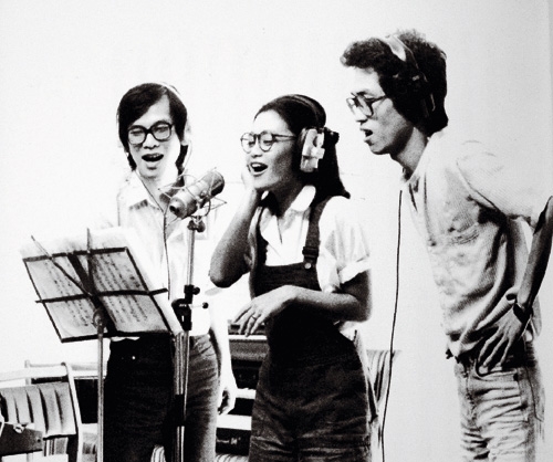 羅大佑與張艾嘉(中)因「閃亮的日子」一曲而結識,成為知音。圖為他與張艾嘉、侯德健在錄音室的合影。