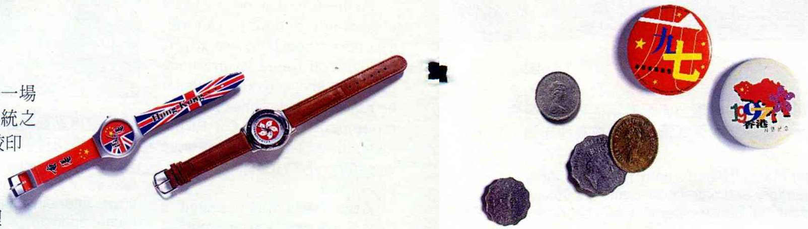 硬幣,人們捏在手中,坐車、買飲料常用的一圓、二圓、五圓硬幣,悄悄地換上新裝,洋紫荊花的圖樣取代了女王頭;較大面額的紙鈔,colony(殖民地)的字樣幾年前早已消失,中國銀行利劍般的高樓,取代英國皇室的標誌,成了紙鈔新圖案。就在觀光客相互提醒著「拿到女王頭硬幣不要花掉,留幾個回去作紀念」時,中環鬧區的天橋上,正有人以面值的倍數,收購女王頭硬幣。