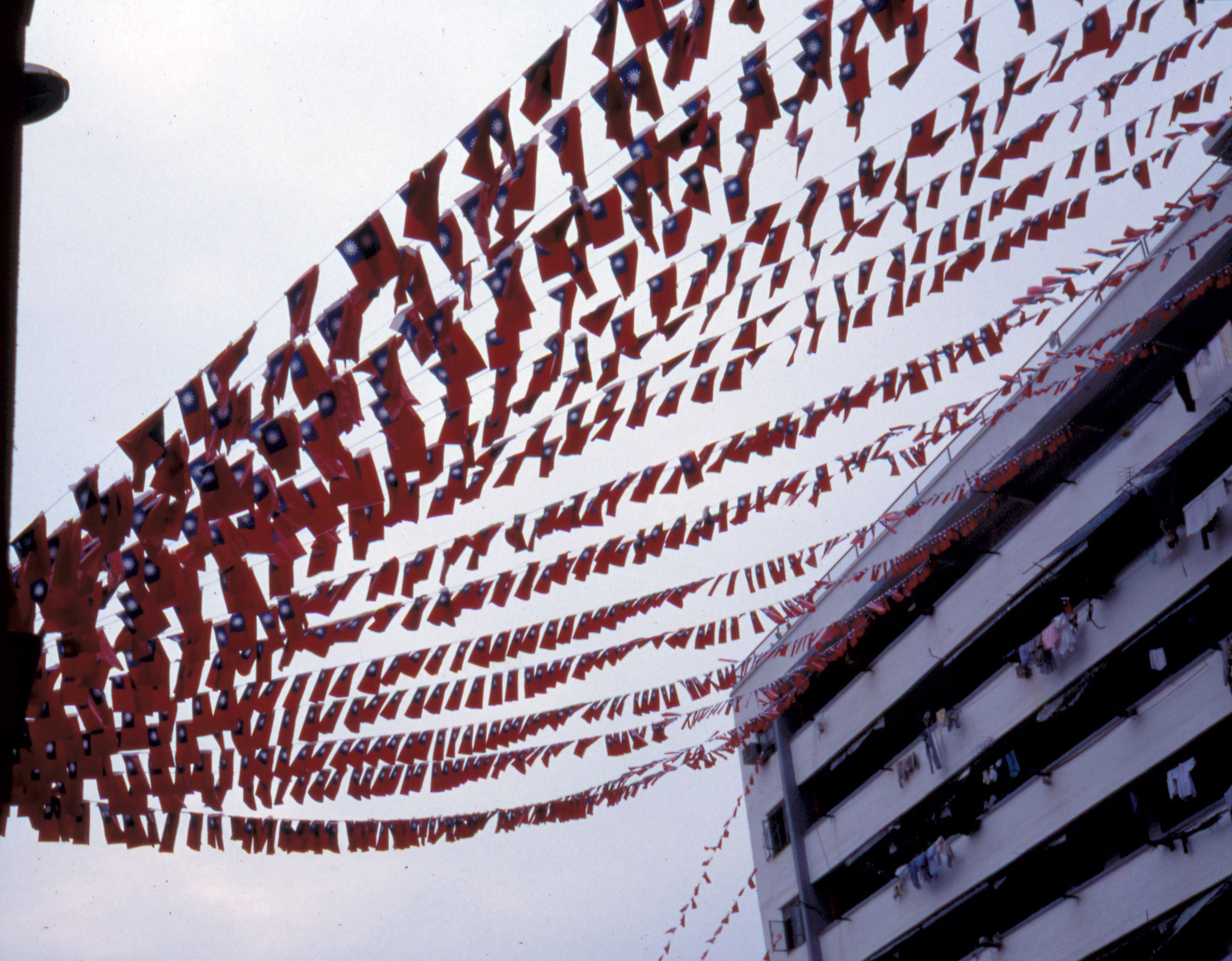 去年雙十節,居民在兩棟樓間掛起國旗。(堯行攝)