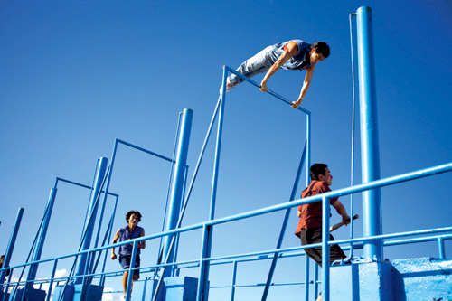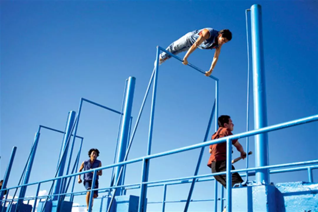 《翻滾吧!阿信》是導演林育賢(右圖左一)哥哥的真實人生,男主角阿信立志在體操界闖出好成績,飾演阿信的彭于晏(左圖中)苦練體操中高難度的單槓、跳馬等動作,毅力驚人。