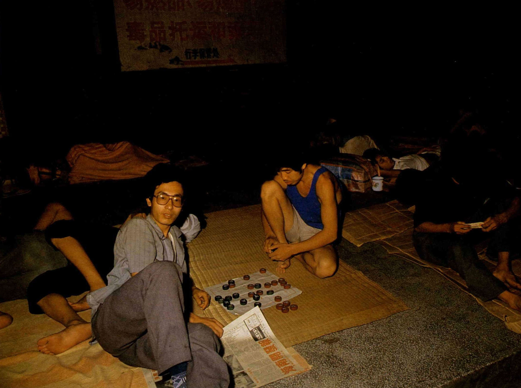 午夜時分,林仁明和他的同伴在他們的「大床」上(海口車站)下棋。(王競)