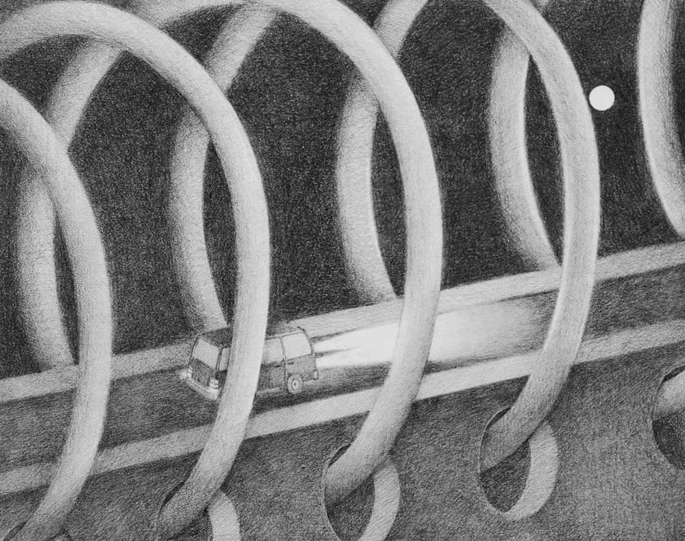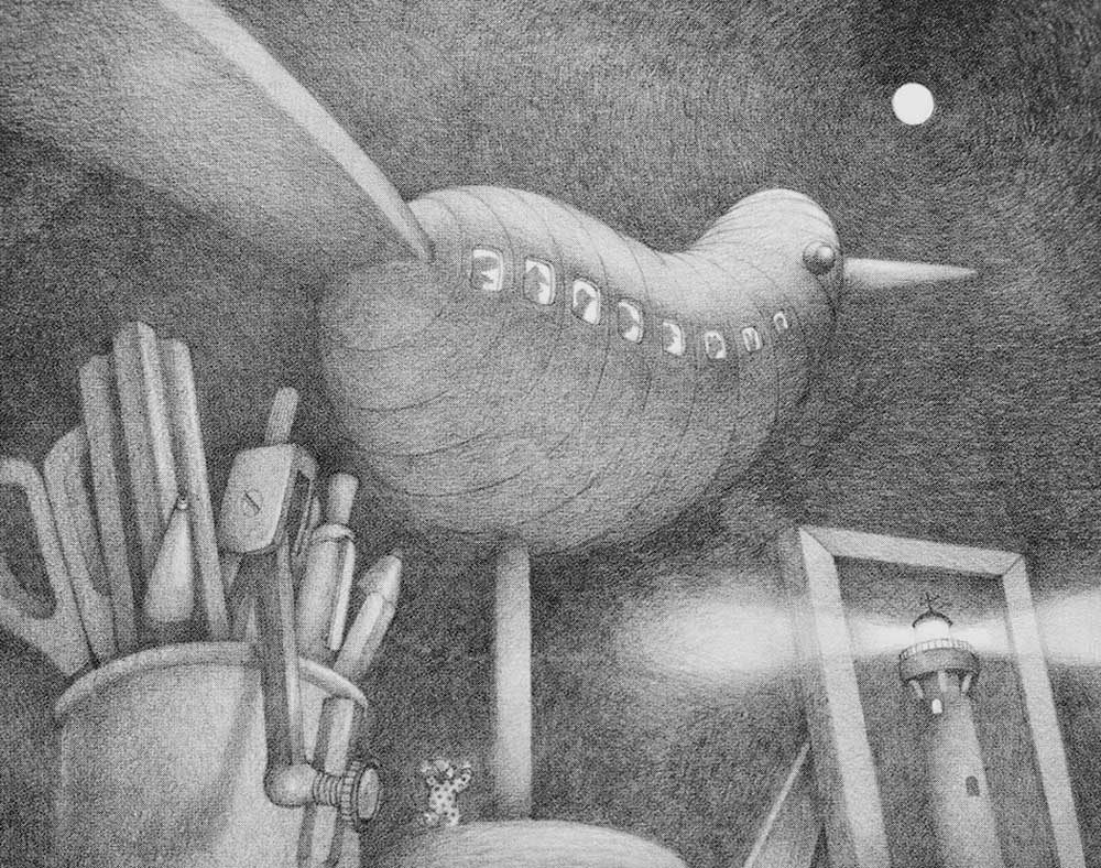 《月光》筆觸細緻柔和,創作者化身旅人,在工作桌上展開一場奇幻旅程,是2013年波隆那插畫展入選作品。