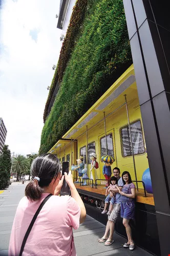 「勤美誠品綠園道」的植生牆面積相當於一座台北永康公園,每天可吸收200公斤二氧化碳。由於長得綠油油,常有觀光客來此拍照留念。