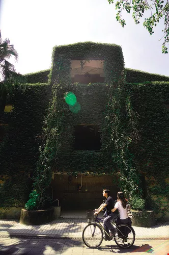 最「天然」的植生牆是由常春藤、爬牆虎等攀附植物自發長成,可惜台灣日照過強,這類植生牆難得一見。圖為台大農學院。