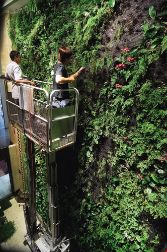 兩廳院的室內綠牆高達2.5層樓,工人必須搭吊車修剪整理,綠牆才能四季長綠。