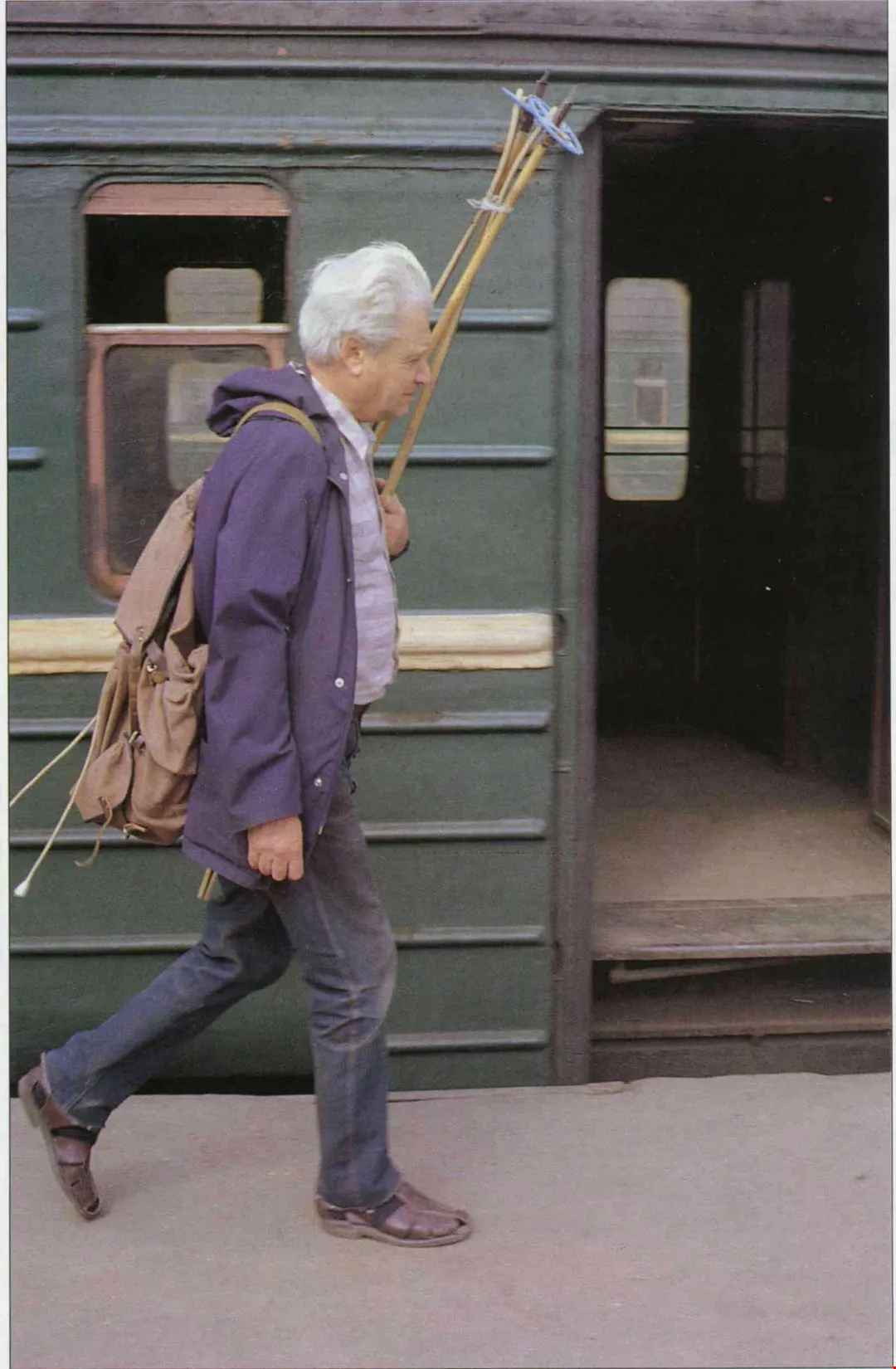 背包、牛仔褲、涼鞋,手上拿著孫女的竹製雪撬,孟列夫滿頭銀髮,仍精神健爍。他正趕搭火車到列寧格勒一百多公里外的別墅度周末。(張良綱)
