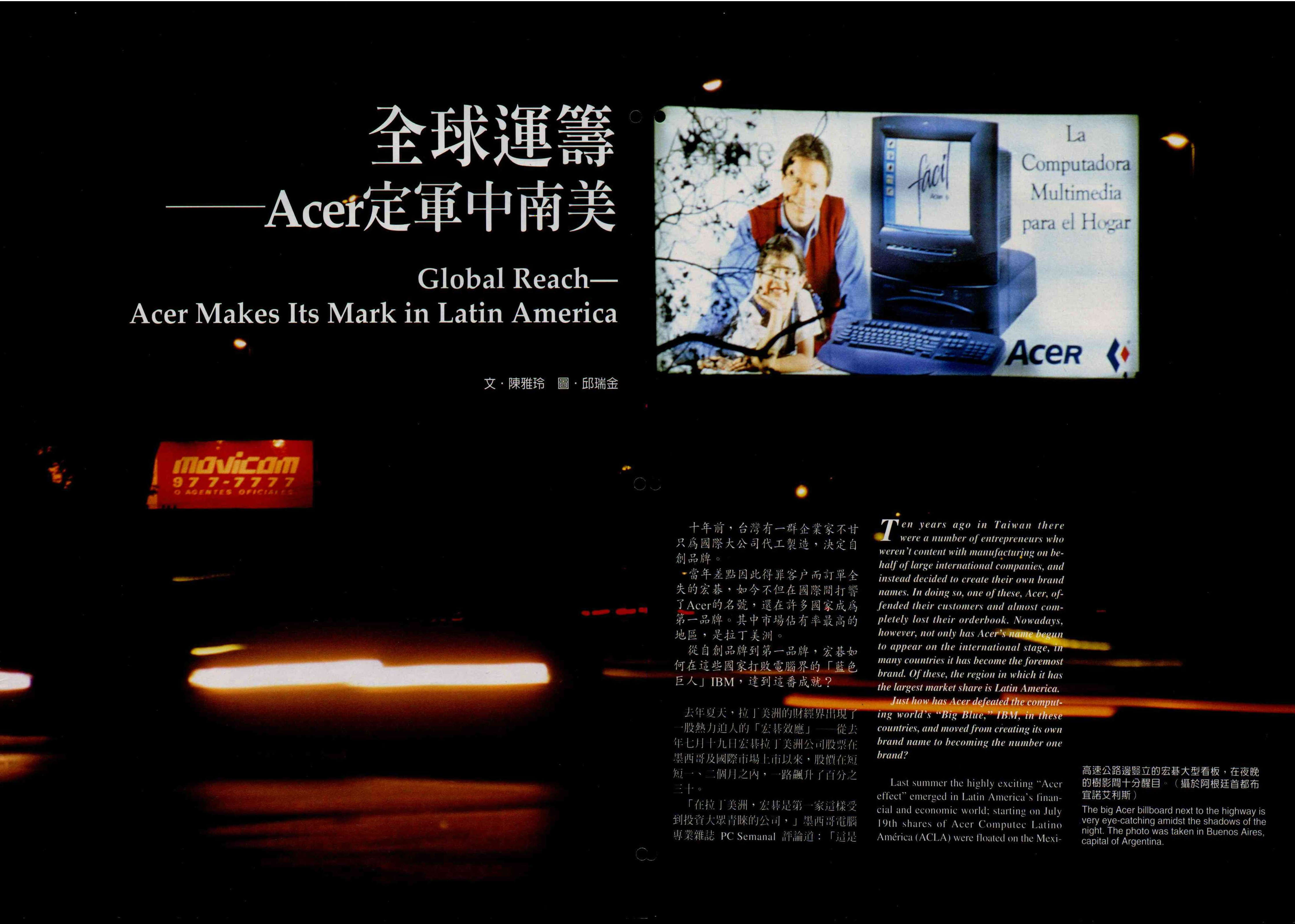 新聞局駐阿根廷四年多的組長詹昭明就感覺,過去在當地市場上不是很活躍的宏碁,一年多來廣告明顯增加。由阿根廷首都布宜諾艾利斯北郊進入市中心的高速公路邊,豎立了一塊宏碁電腦的大看板,十分醒目。