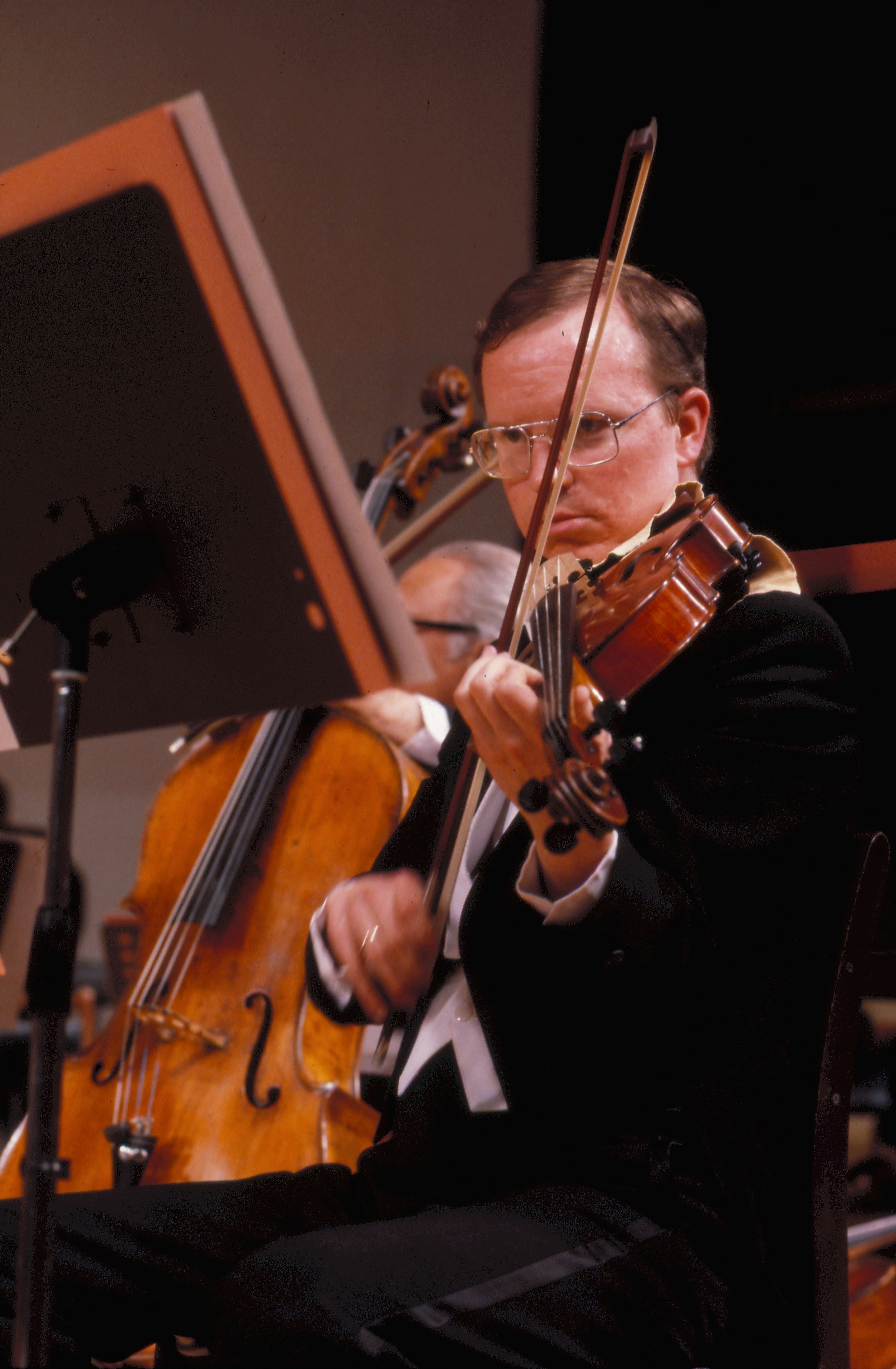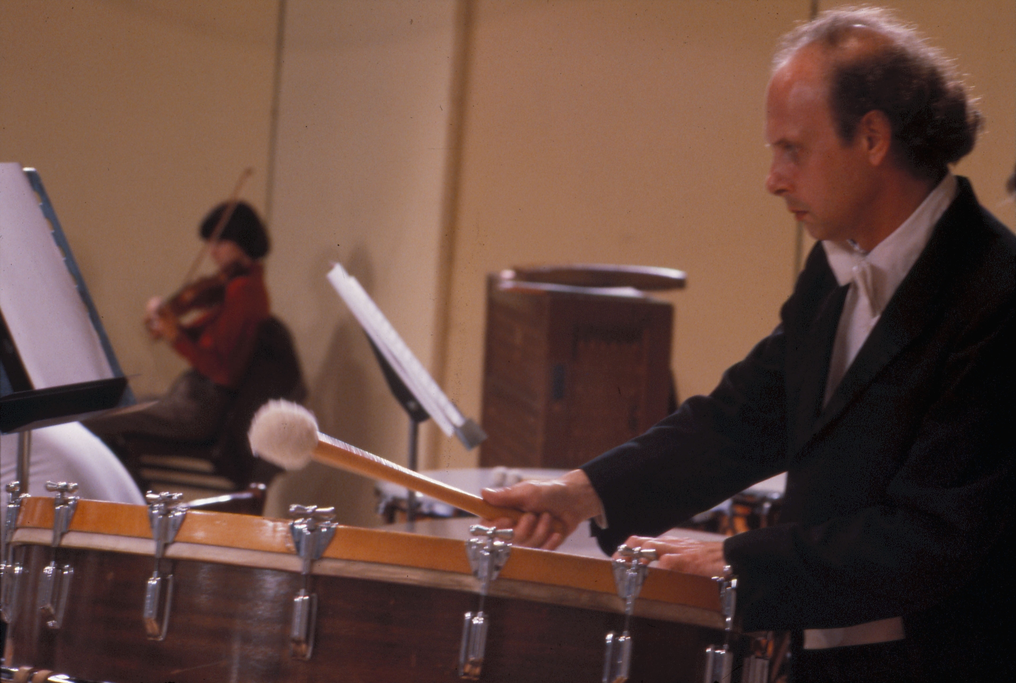 圖1.2:美國國家交響樂團一位小提琴手和一位鼓手演奏的神情。(李影/唐根禮/李培徽)