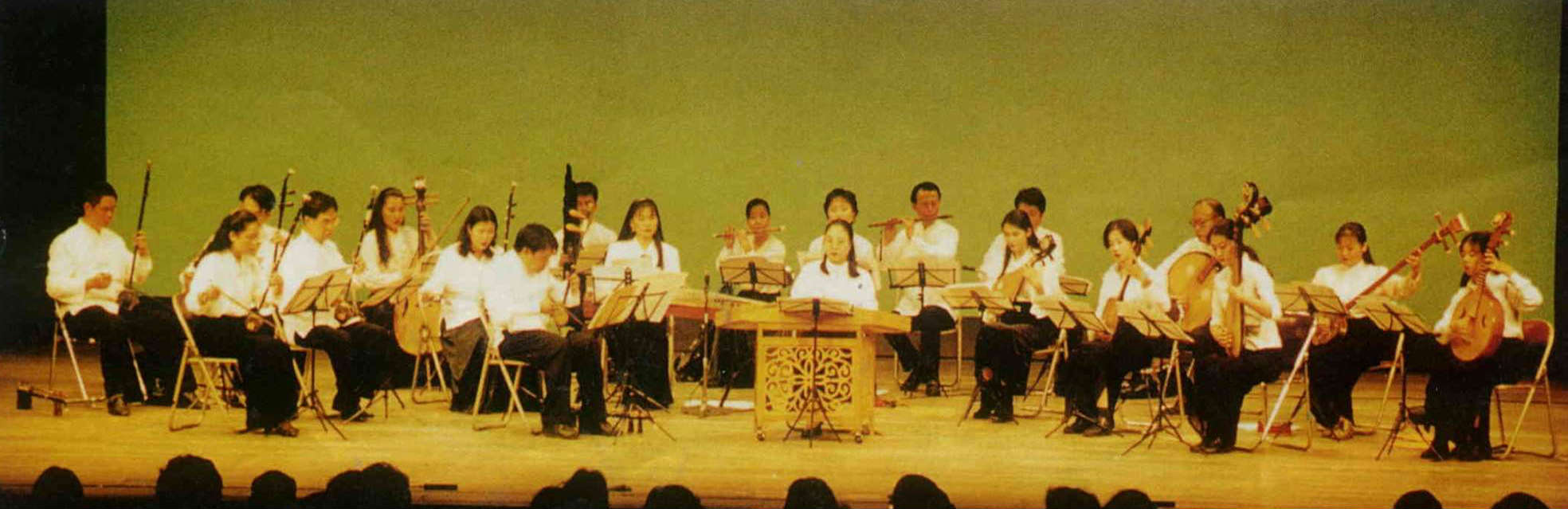 一九九八年二月,帶著復古的「御座樂」樂器,台灣《民風樂集》與沖繩御座樂研究會成員,在那霸縣立鄉土劇場合演了一場「夢幻宮廷之樂」。(陳焜晉提供)