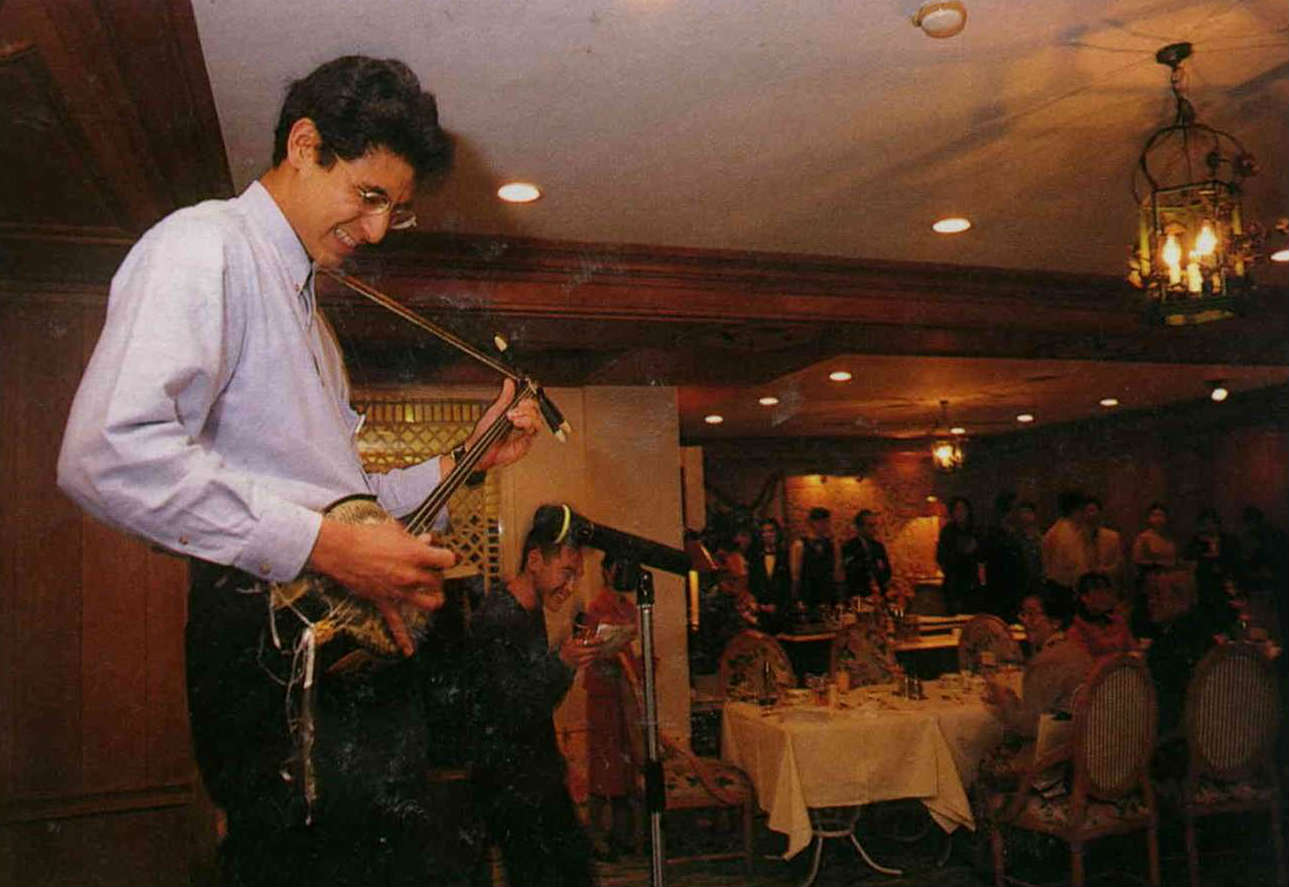 一九九八年一月沖繩人在台新年會,一位沖繩在台留學生奏起「三味弦」,這是衝繩民間流傳很廣的樂器,源自中國。(張良綱)
