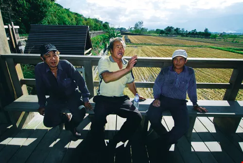 林龍星(中)和當地農人們聊起「池上米」認證推行以後,種稻的利潤較過去增加兩倍之多,每公頃可多3,000元收入。
