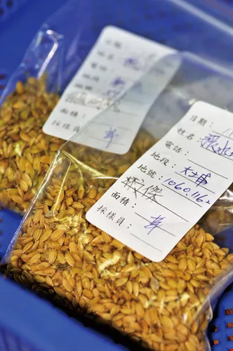 每一包到田裡採收回來的稻穀樣品,上面都標有姓名、地號、檢驗員等詳細資訊。