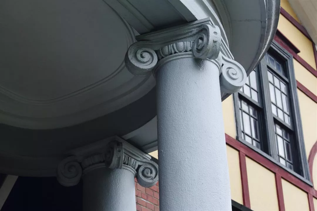 西式窗戶、圓柱、彩色玻璃等設計,故事館的造型別有趣味。
