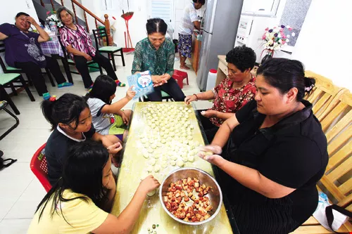 剛搬入長治基地的佳暮村民許秀香家中聚集了各地親友,他們正在準備魯凱慶典中不可或缺的食物──以小米麵皮包裹豬肉的「阿拜」。