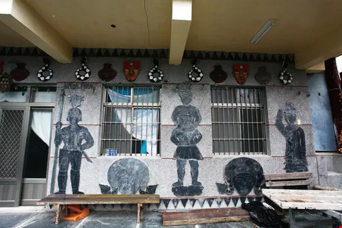 魯凱的家屋蘊含豐富的文化和社會意涵,不同階級的家屋各有不同圖騰。圖為阿禮村大頭目石板家屋旁加蓋的二層樓房,牆面百步蛇和紅蝴蝶結人像,都是大頭目家才能有的裝飾。