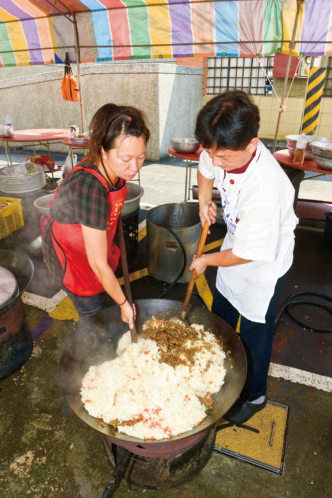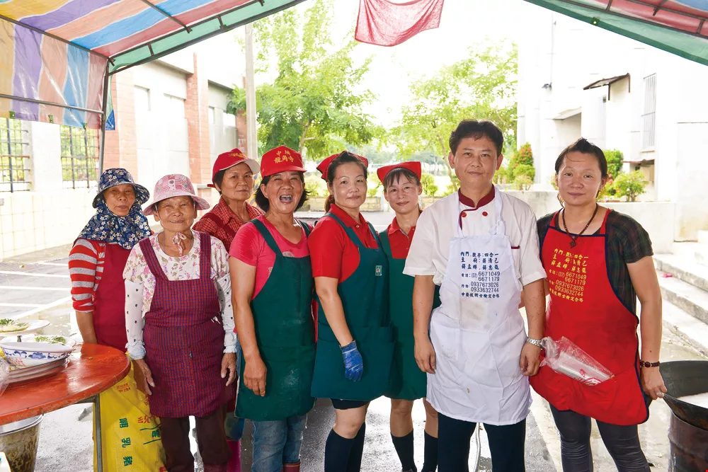 周日清晨6點,高雄美濃東門國小禮堂旁,總舖師薛明輝與太太冷典霖,和四、五位助手,飛快地切菜、剁肉備料。越近中午,爐火越燒越烈,吆喝聲此起彼落。