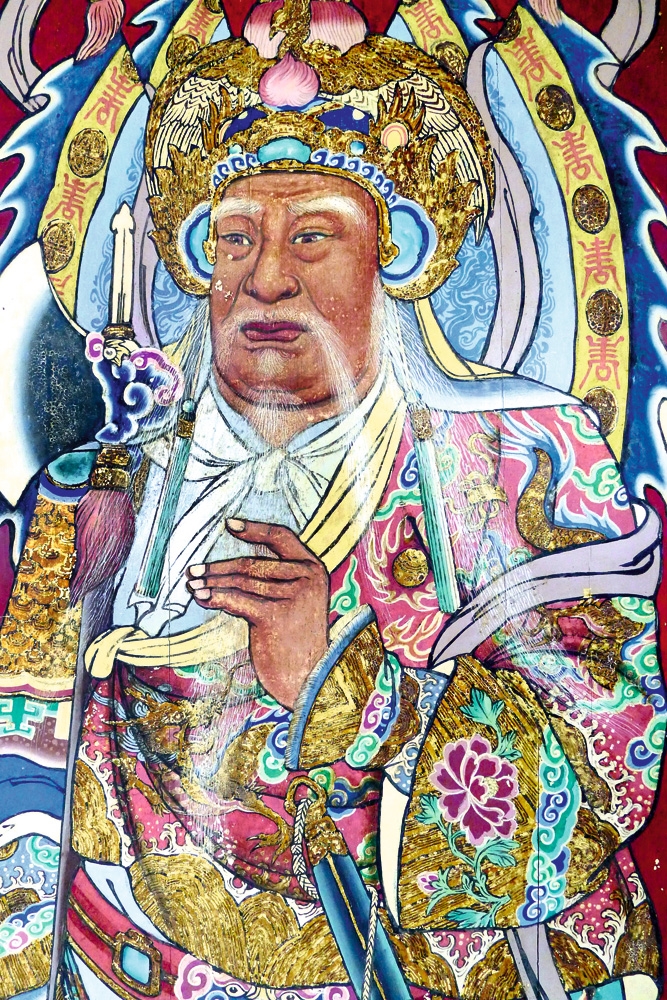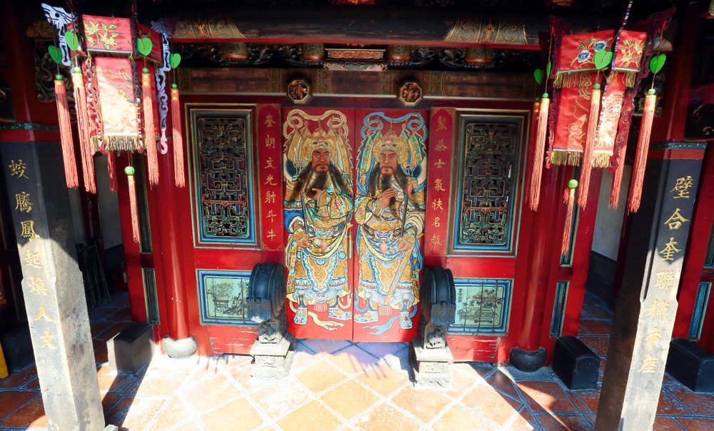 陳壽彝彩繪的12扇門神,6扇在凌虛殿,6扇在聚奎閣,這兩處分別是通往三官大帝與文昌帝君旁殿的門廳。個別的6扇木門之中,除了中間兩扇皆為文官武將門神之外,凌虛殿左、右兩側的門上,各畫有10尊及12尊神祇,分別代表中國古代曆法中的天干與地支。