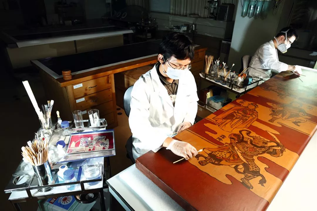 用科學儀器分析污損程度之後,待修的門神彩繪門板被送進實驗室,由科學修復團隊進行除污、加固、補色等工序。