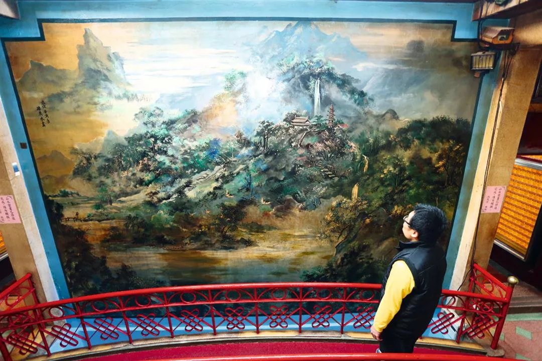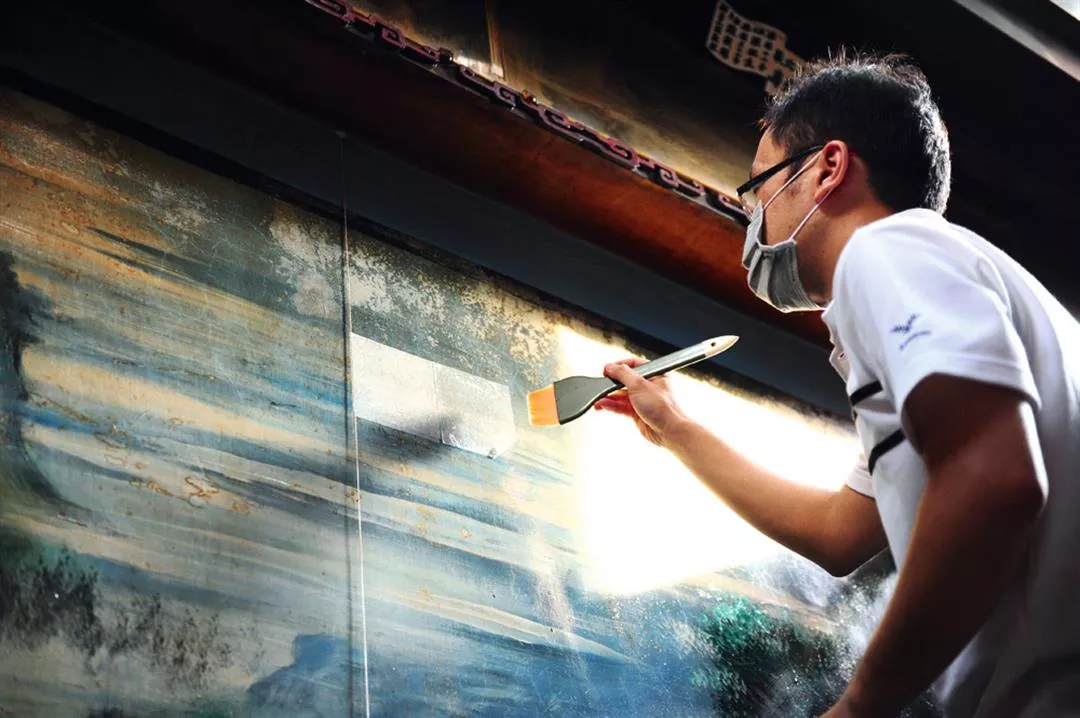 高雄代天宮內由已故傳統畫師潘麗水彩繪的山水壁畫,經藥劑測試後,進行表面除污。