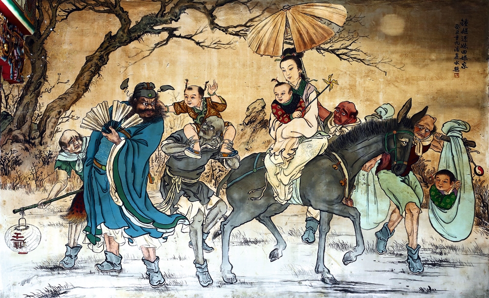 傳統廟宇彩繪畫師都是人間國寶。圖為潘麗水生前創作台北大龍峒保安宮7幅壁畫之一的〈鍾馗迎妹回娘家〉(左),及陳壽彝彩繪的北港朝天宮聚奎閣文官武將門神(右)。
