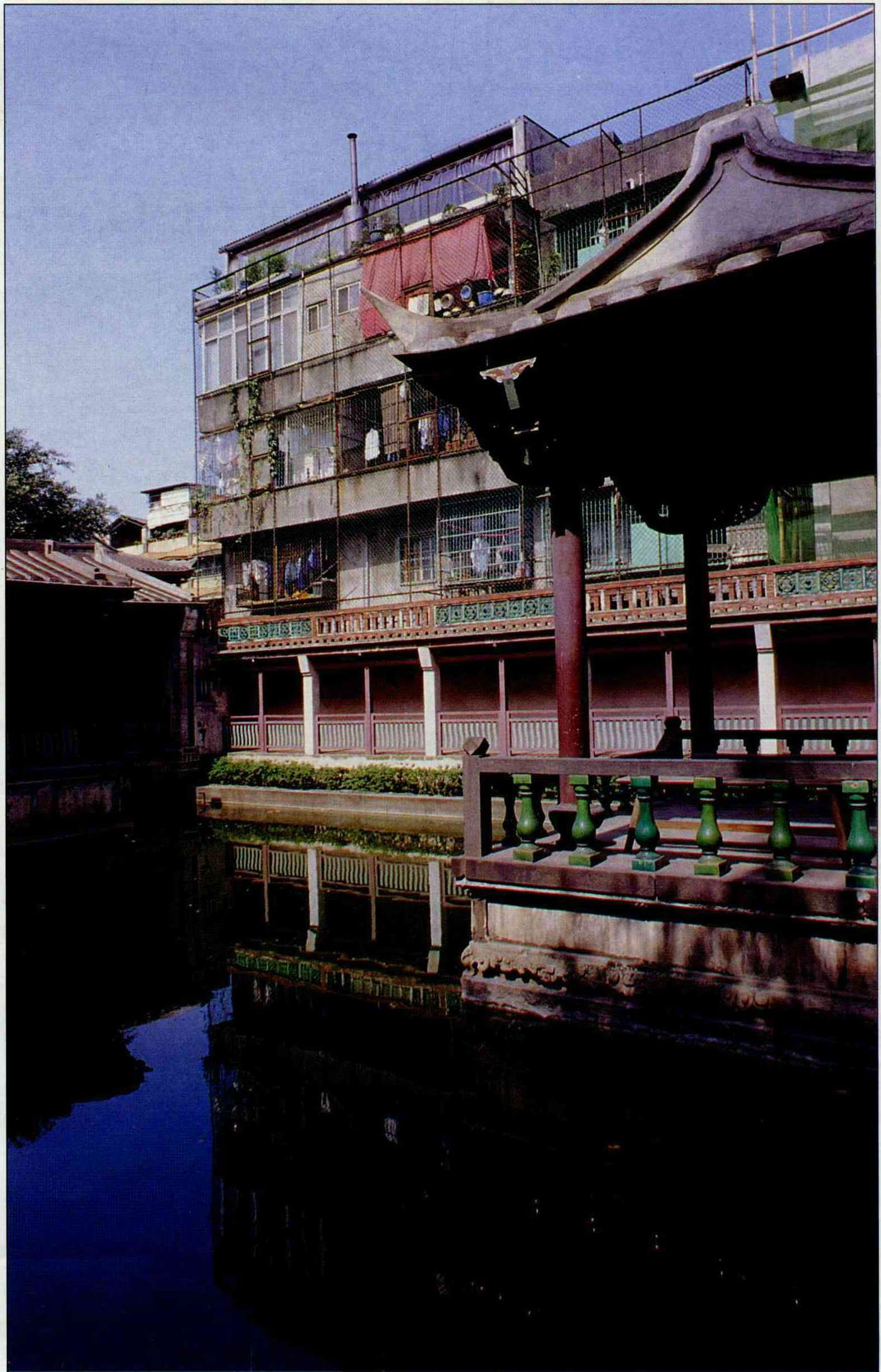 經濟發展與古蹟維護常難兩全,林家花園的亭台樓閣之後,竟是凌亂的現代公寓後窗。(卜華志攝)