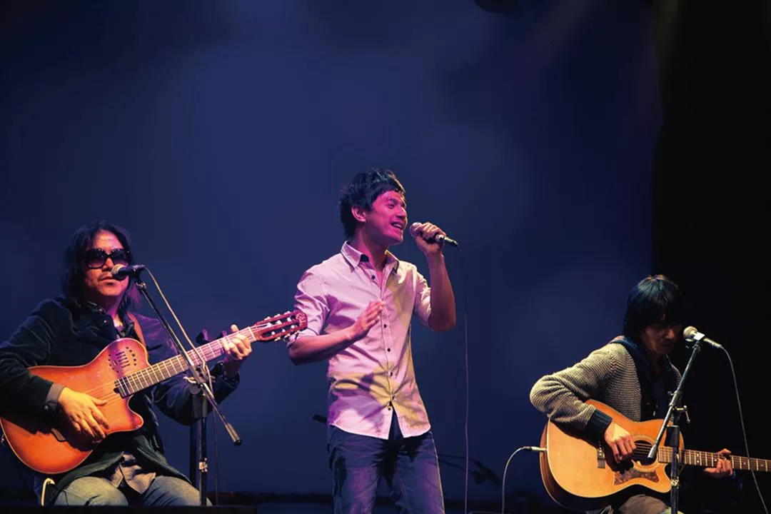 2012年走江湖音樂節,大陸盲人歌手周雲蓬、陳永龍與萬曉利(由左至右),帶給台灣樂迷一場新民歌洗禮。