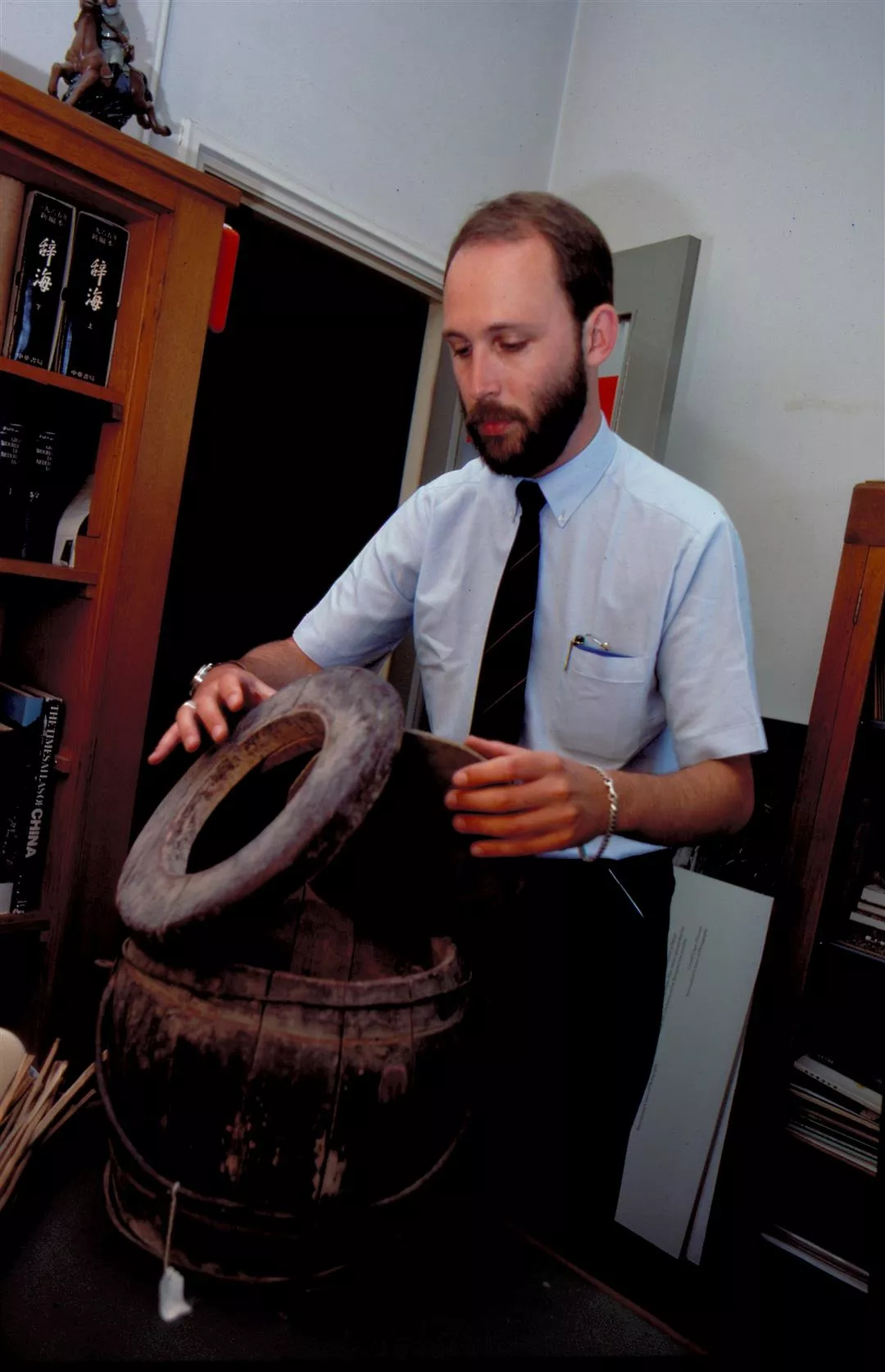 威廉館長背後的明代漆屏風是高羅佩的收藏之一。(高羅佩家族提供/鄭元慶)