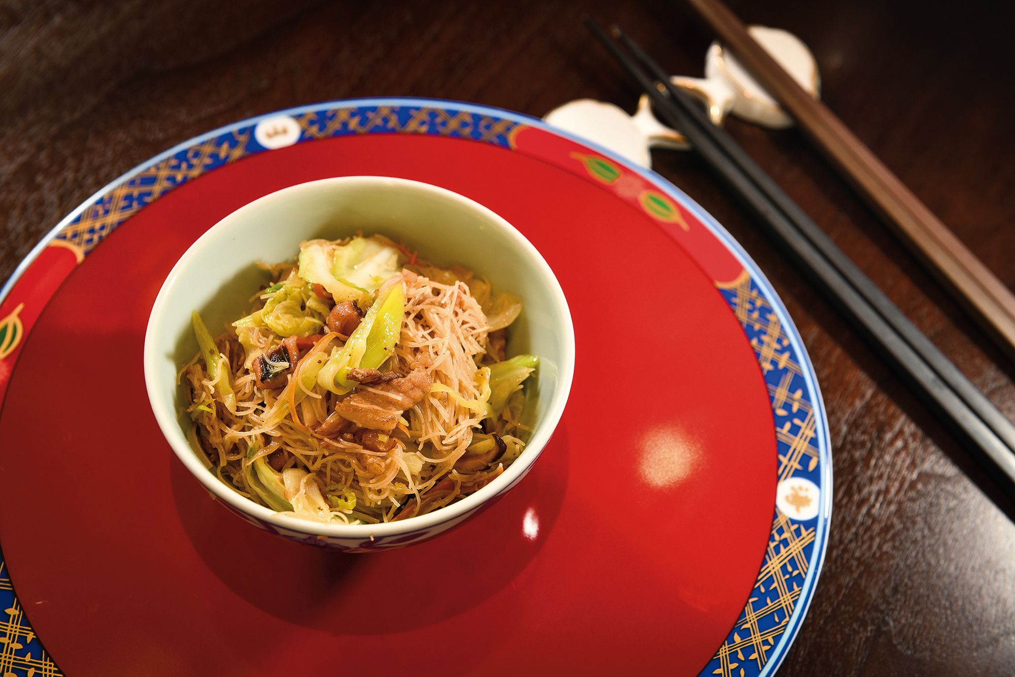 在這樣的空間,端上了一道由鑲金瓷盤盛裝的「扁魚春捲」,酥黃餅皮,裹著由扁魚、銀芽、蝦仁製成的內餡,佐上一盅金澄的雞高湯;這一道可溯源至日治時代的「酒家菜」,滋味清新俊逸,雖然看似熟稔,卻又令人有幾許歡喜的陌生。