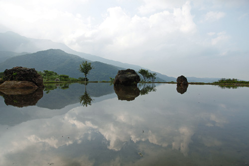 八煙水田環境復育後,波光粼粼映照著山景,彷如桃花源祕境。