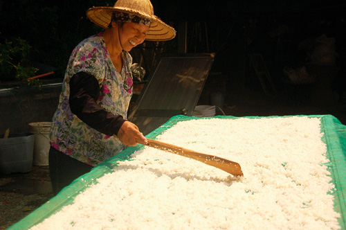 水梯田稻米蒸熟後曬乾,可製成米香原料。