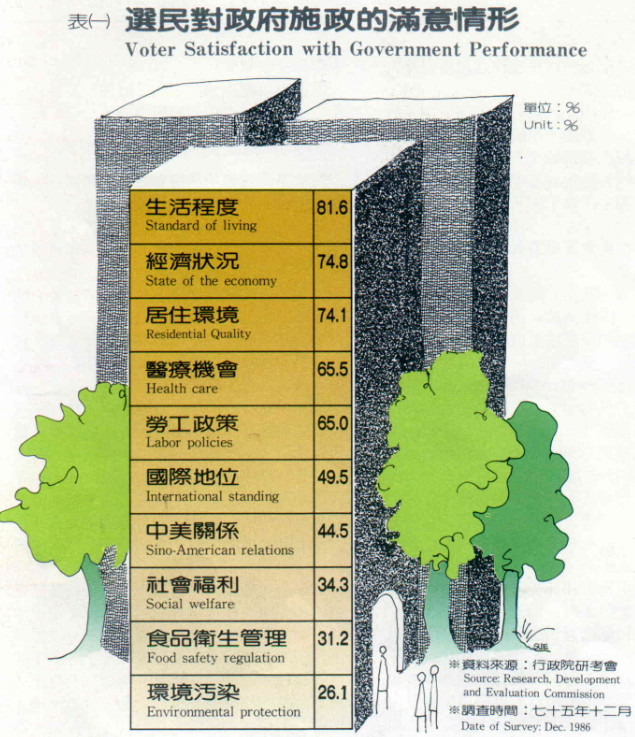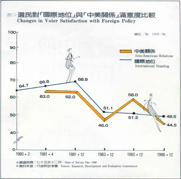 答:原因可能很複雜,不過大致來看,到七十四年滿意度上升,可能與幾個因素有關:一是錢代表七十二年上任後所做的努力;一是中美關係經過以往的調適,在七十二年後進入穩定階段,不致產生重大的問題,媒體也比較給予肯定。