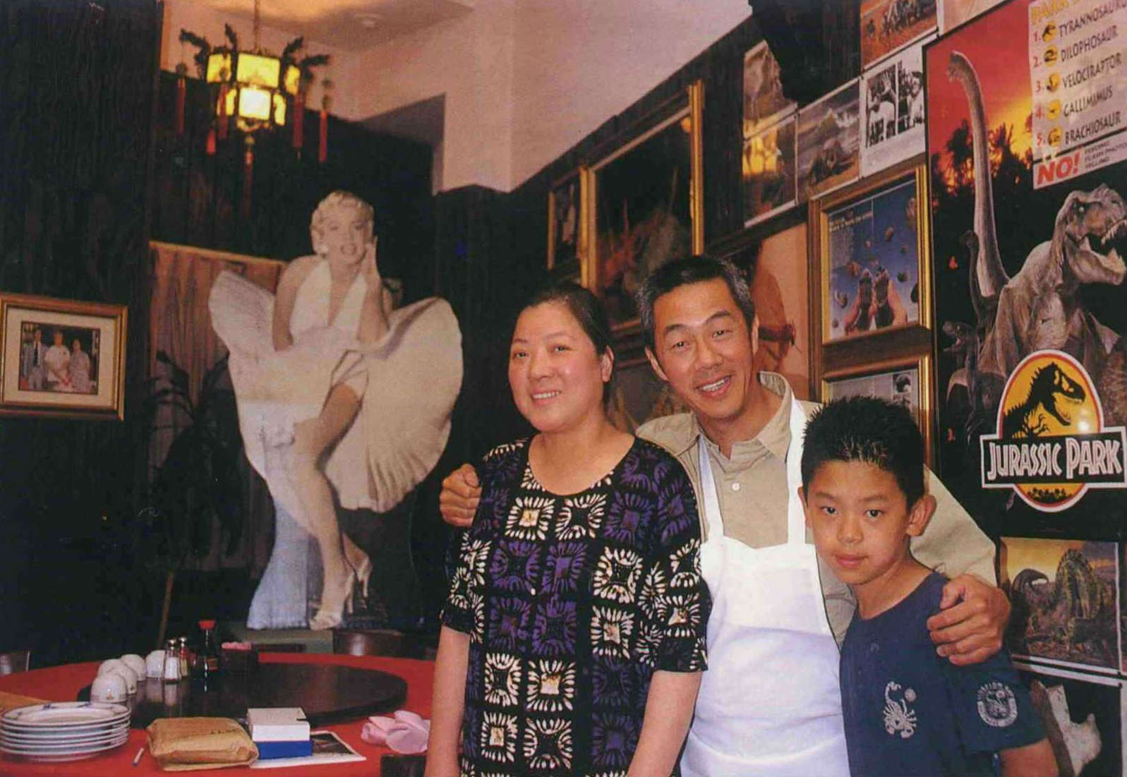 中國王大廚的餐廳,除了以美食吸引食客,還有美國豔星夢露和恐龍的海報、照片等。王大廚一家三口和樂融融,為生活打拚。(薛繼光)