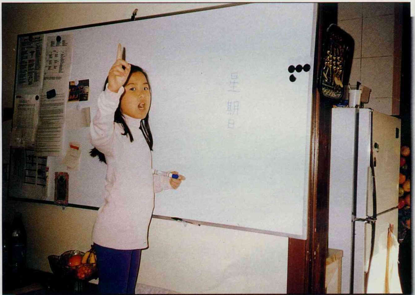 為了孩子的塗鴉,我特地到文具店買了一個特大號教學用的白板,每週上完一課之後,我習慣與孩子們討論課文的內容,看看有沒有不懂得地方,孩子們對於寫白板均有一種說不出的喜愛。有時心血來潮,我假裝不懂課文所教的或平常用語,請孩子當我的小老師,而我坐在白板前面的桌椅,乖乖的當他的學生。只見他寫好了字,拿起長長的即將丟棄的收音機天線(當作教鞭),在白板上敲敲,對我直說:「注意!看!看這邊。這個字要這樣寫……」,有時他問我問題,我假裝真的不懂的樣子,他越說越起勁,有時還會以老師的口氣罵一頓。好一副小老師的模樣,教起來有板有眼的,有時還會主動要求說:「媽媽我們來教書好不好?」這時就是有再重要的是,都沒有比他的教書重要。家裡準備一個白板,或大或小,除了教學,平常也當做留言用,也是孩子畫畫塗塗的好地方。