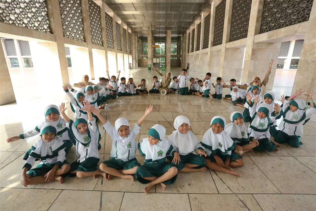 印尼中產階級人數增加,帶來龐大的消費力,雅加達伊斯提奎清真寺裡的孩童綻露笑容。(林格立攝)