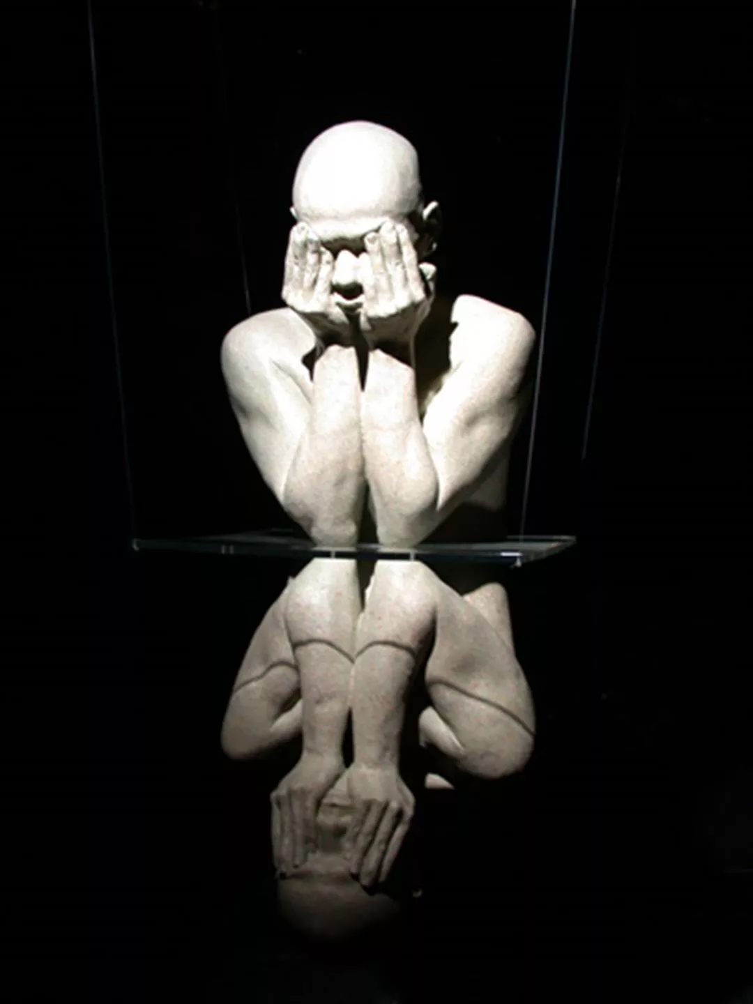 〈我與自己對話〉利用樹脂上彩與壓克力複合媒材,王志文將兩個一模一樣的男子雙手掩臉的半身雕塑隔著透明壓克力板如鏡面般對置,並以釣魚線懸吊在展場中,營造恍若真人漂浮於空間裡的視覺效果。