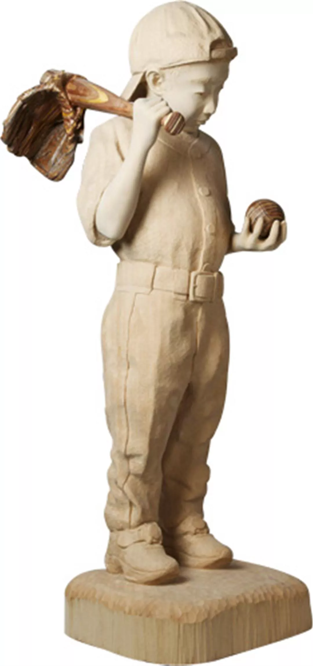 以〈宅男孩〉為例,在頭髮的部分保留木雕特有的鑿痕式線條,在肌膚表面,則揚棄木雕慣有的油亮手法,改以銼刀和砂紙磨出人體毛孔的膚質,充滿泥塑的溫柔觸感;又因為臨摹精準,小孩全身上下不管緊緻的臉蛋或摺皺的膝蓋,都栩栩如生。而集成材所雕成的圍巾,又提供了作品豐富層次感。