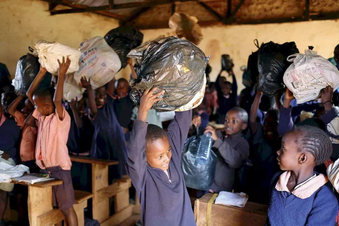 楊右任用贈鞋的機會一石二鳥,在當地舉辦「垃 圾換鞋」活動,許多小孩扛著撿來的垃圾響應。 既換到了鞋,也整治了當地的環境。