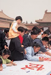 號稱神州第一街的長安大街,由天安門前左右延伸,長約七公里,寬約八十公尺,今天大陸國慶閱兵大典走的就是這長安大街。兩旁高貴氣派的新東方廣場、恆基中心名品商店、百貨大樓林立,人行道與台灣的馬路一樣寬,依然有著過往王朝雄偉的懾人氣勢。而來往公交車(公車),廣告看版上許多慶祝北京申奧成功的標語,更赤裸裸地呈現了大陸與世界接軌,迎向現代生活的企圖。