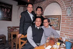 今天許多東城的大宅門被改裝成前衛的酒吧,是兩岸文化人最喜歡聚會的地方。前為研究藏書票的吳興文(右)與前晶華書店負責人黃智華,後為京萃週刊主編劉明君(左)與酒吧老闆鞏敬吾。